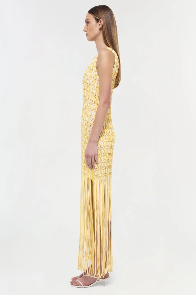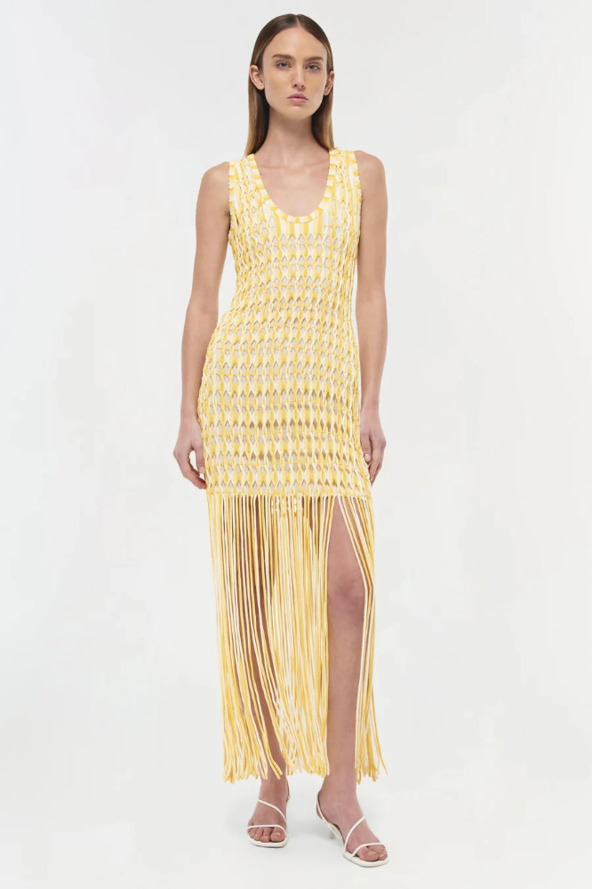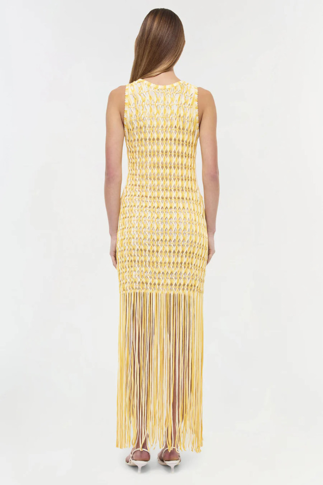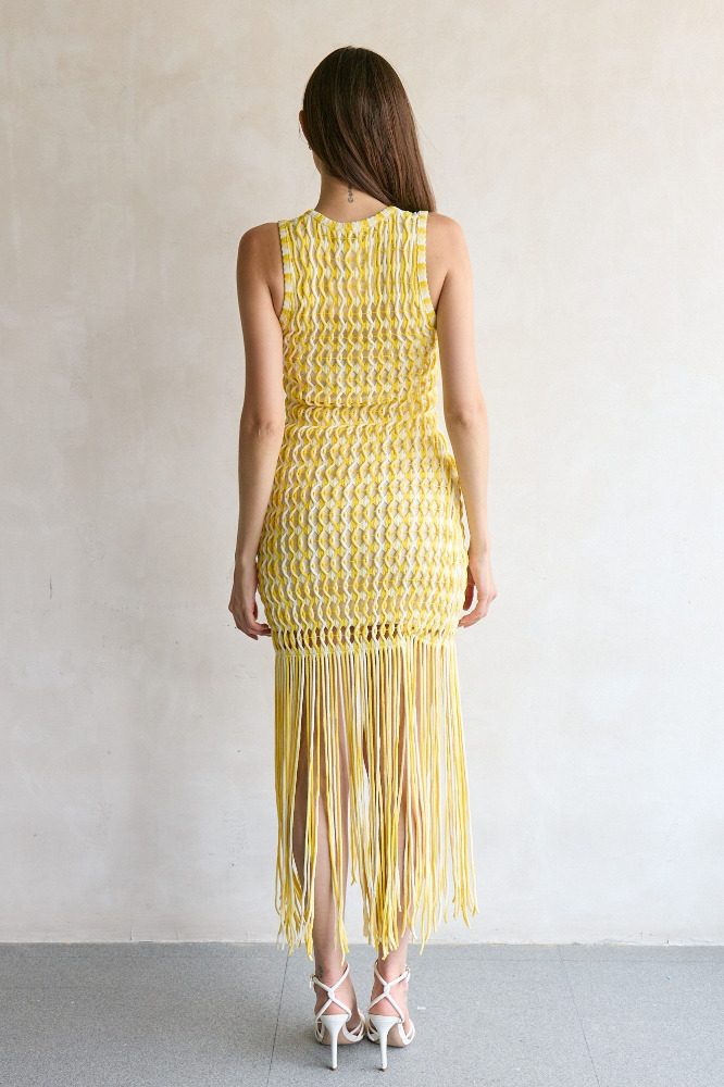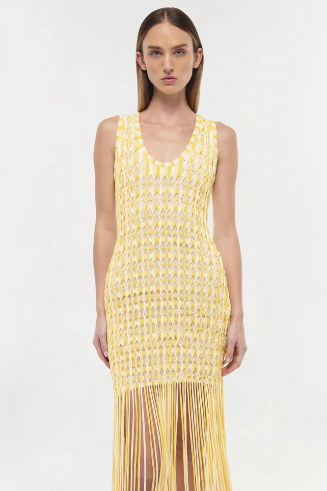 Featuring open twist fringe detailing, this striking tank dress offers dynamic movement and bold, textural appeal.