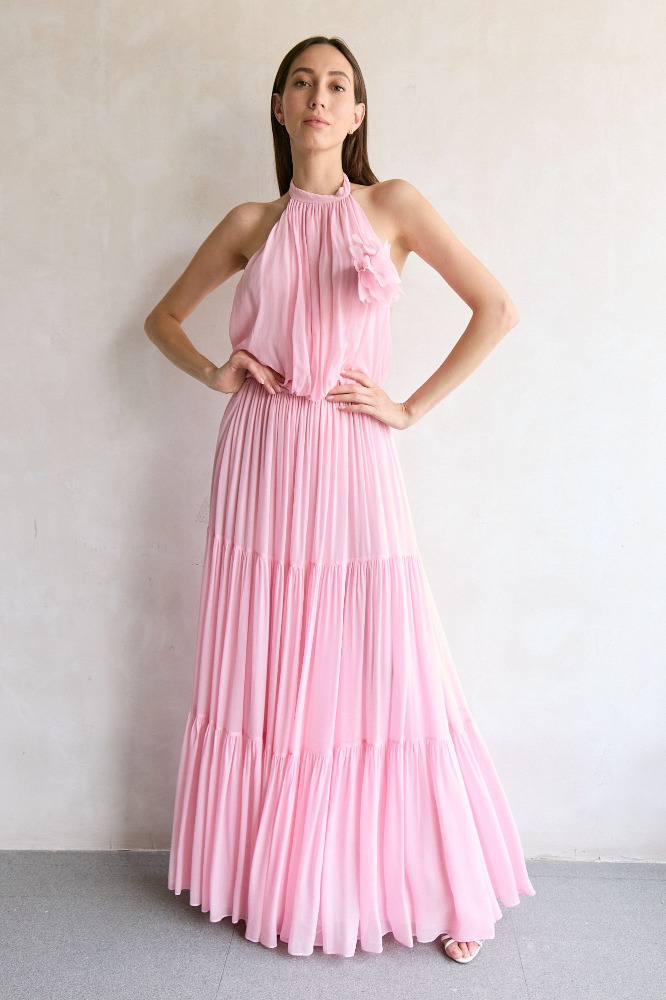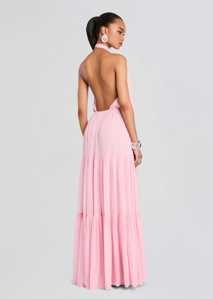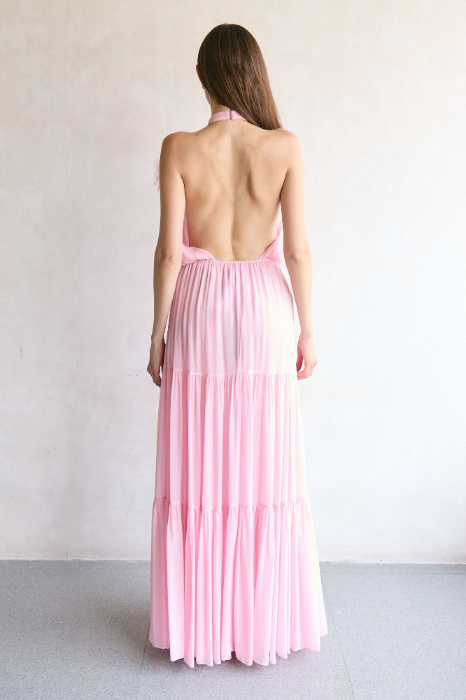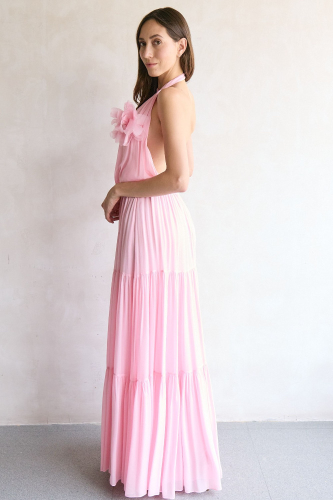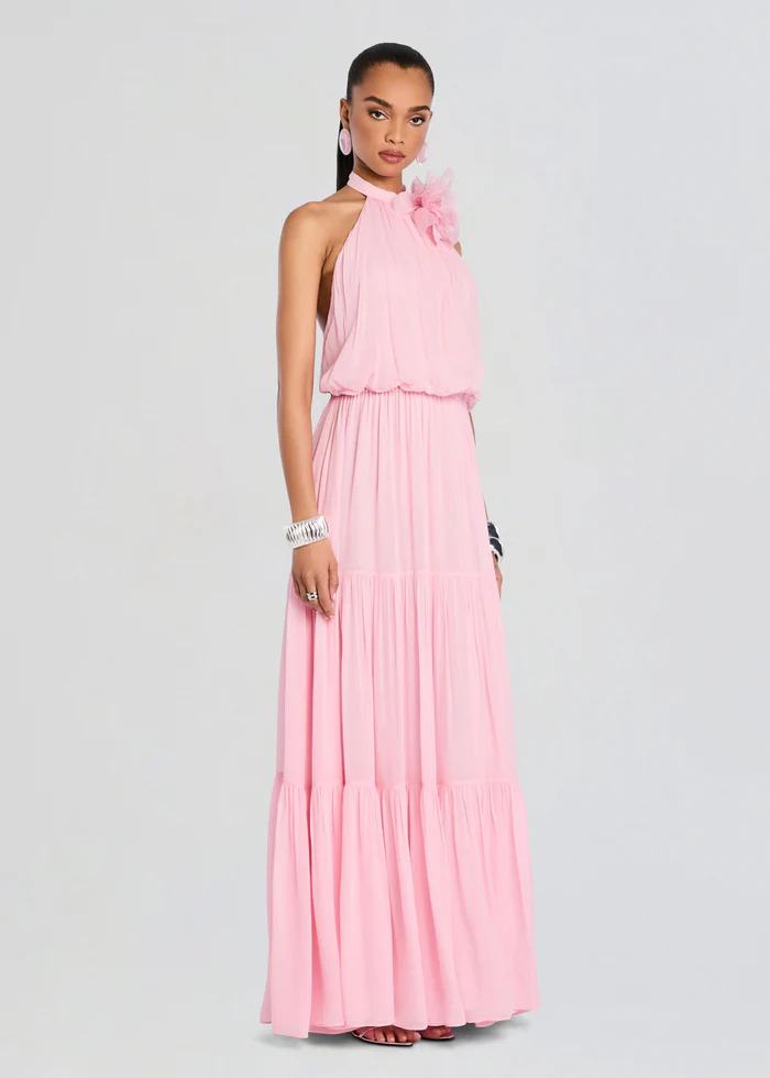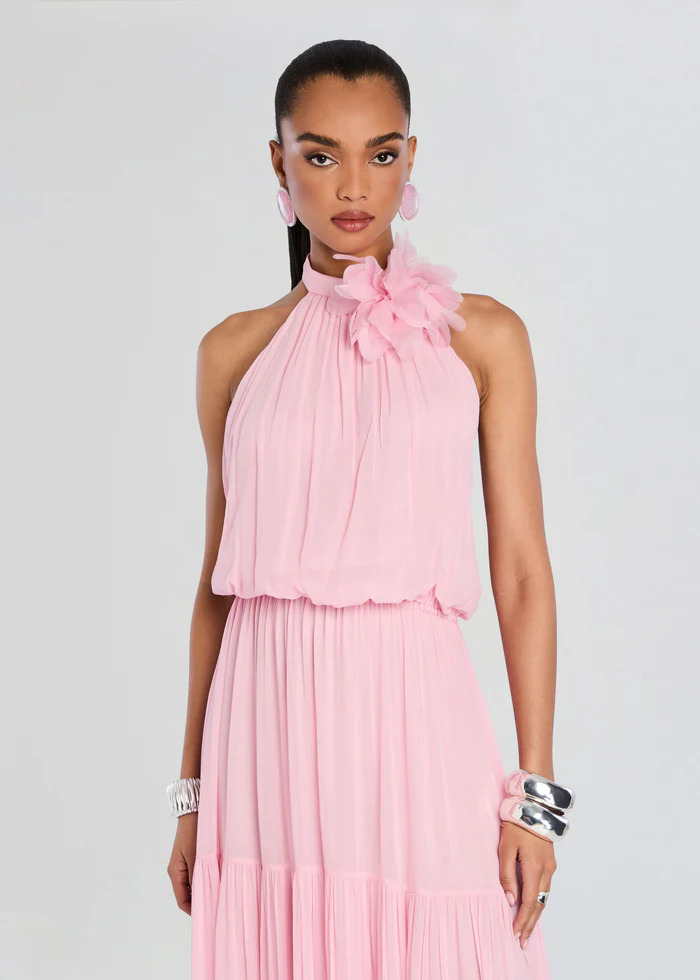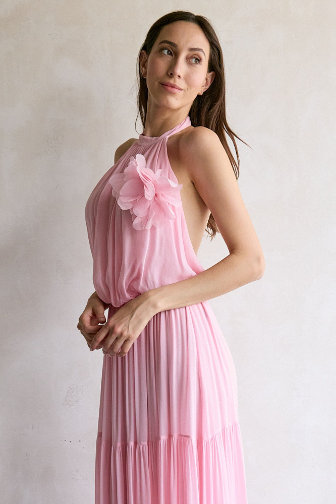 Indulge in the timeless elegance of the Stephanie Dress. This high neck maxi dress boasts a stunning open back and is adorned with a removable flower detail, adding a touch of sophistication and luxury. Perfect for a special occasion, this dress will make you feel effortlessly glamorous.