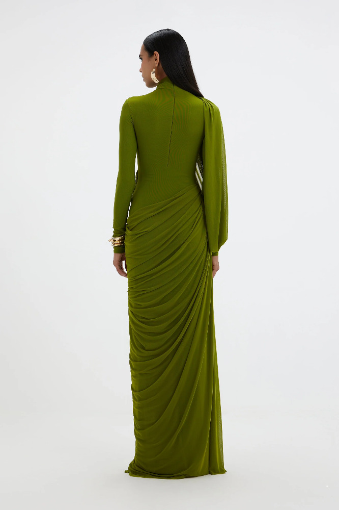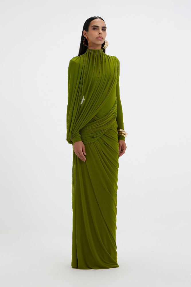 A sculptural silhouette in a refreshing lime hue, this high-neck gown features full sleeves and an artfully draped bottom that cascades asymmetrically from one side. At the top, a pleated drape flows from the neckline, elegantly twisting around the arm and anchoring at the side to form a soft loop — allowing the hand to slip through effortlessly. A perfect blend of structure and fluidity, this gown redefines modern elegance with a touch of drama.