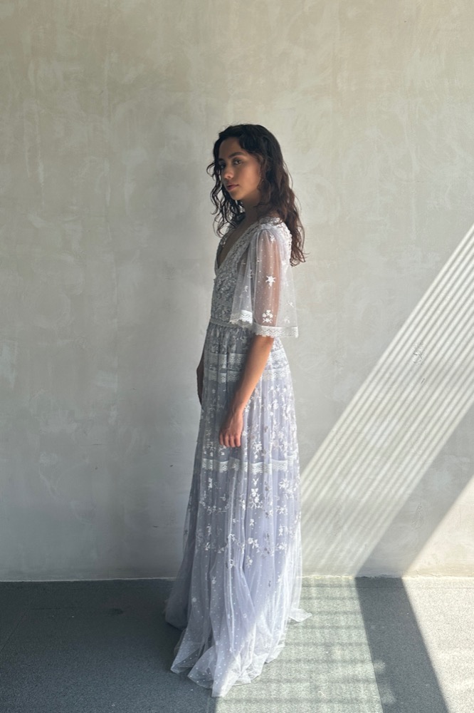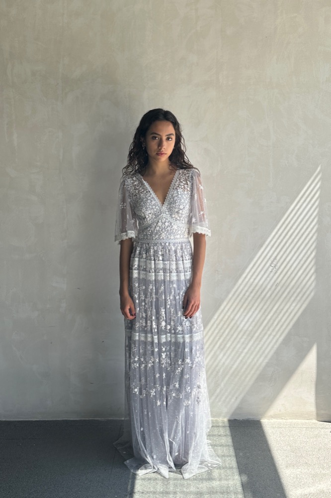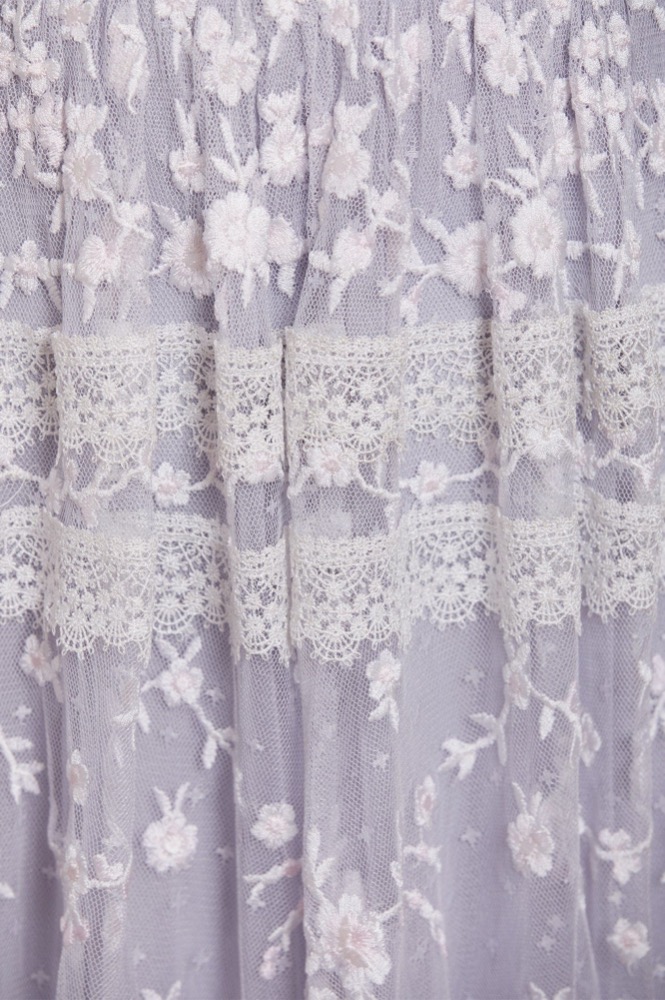 The Sweetheart Lace Gown in Powder Pink/White. A signature Needle & Thread style. This gown is embroidered delicately with a floral lace artwork. Designed beautifully with intricate trimmed lace in pretty border motifs and perfectly positioned tiers through the skirt. Crafted from soft, kisses tulle creating a romantic texture throughout. The perfect gown to take you from day to night.