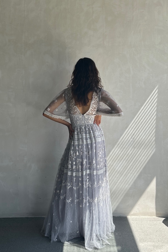 - Kisses tulle decorated with tonal embroidery and lace trims