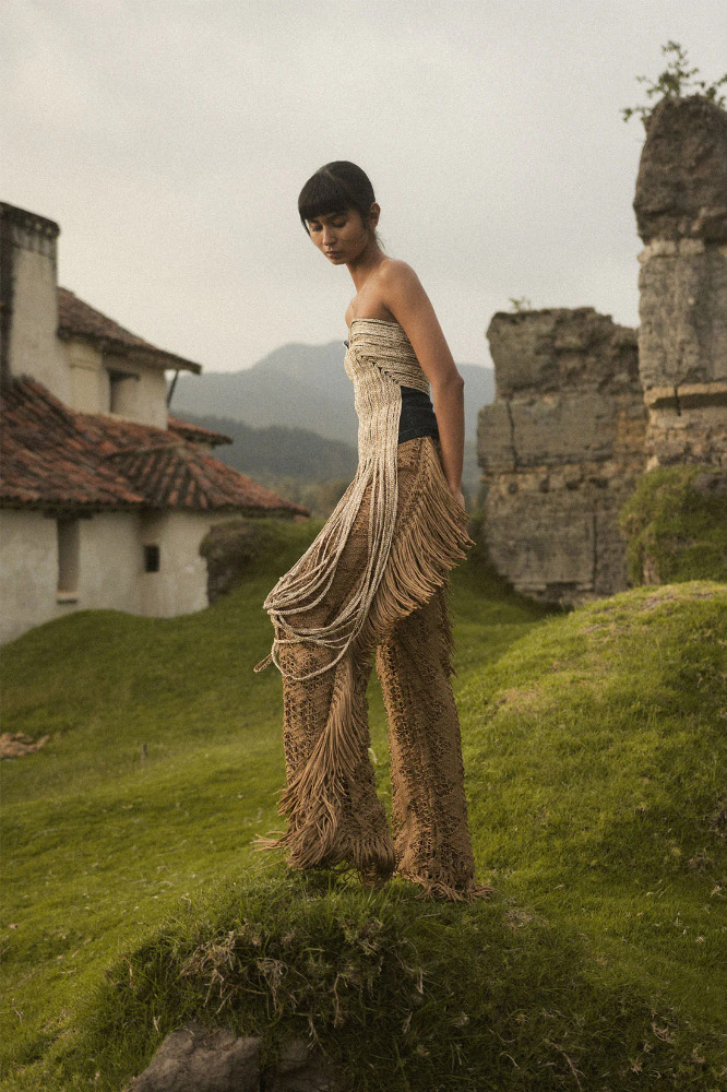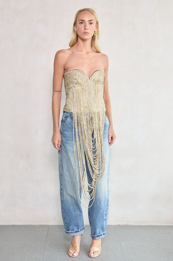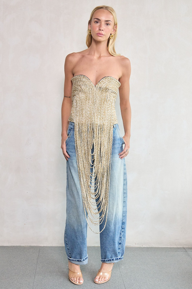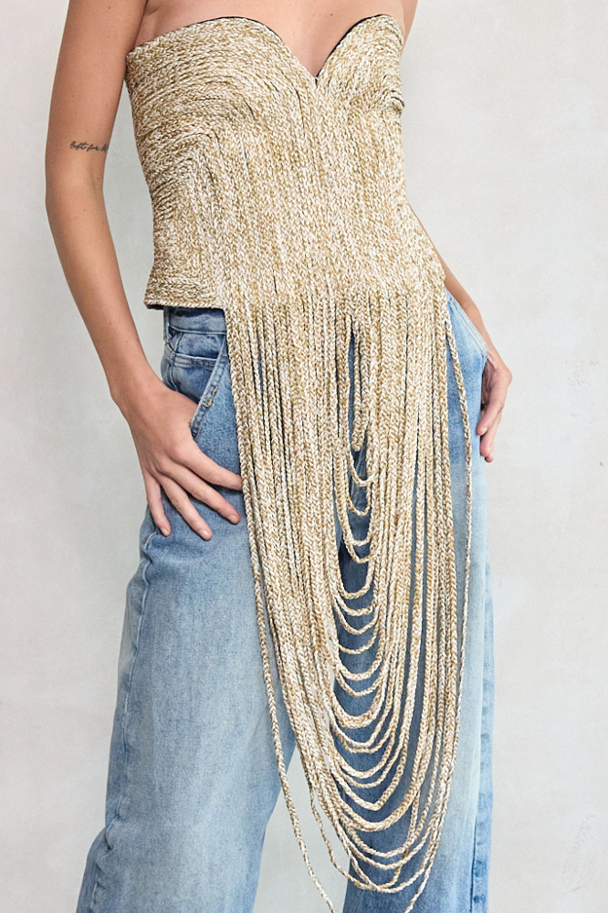 This handcrafted corset features a sculpted silhouette with a sweetheart neckline, woven in beige and gold threads that create a herringbone-like texture. Long frontal fringes add fluidity and drama to the piece. The back contrasts with deep denim and a visible gold zipper, giving the design a contemporary twist. A blend of rustic craftsmanship and refined elegance, this corset is ideal for unique, bohemian-inspired or editorial looks.