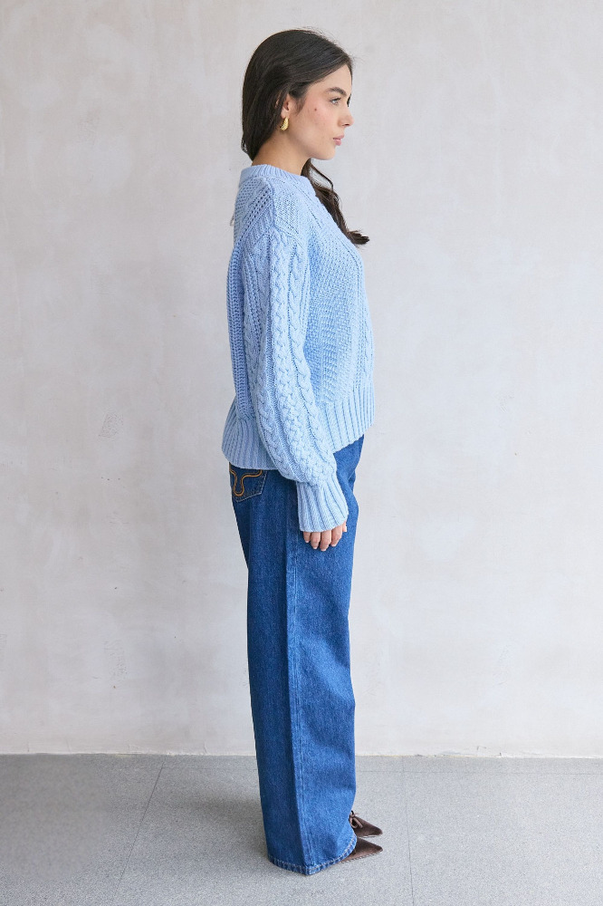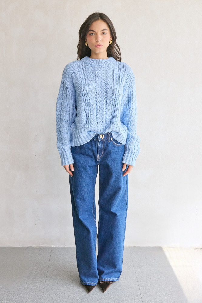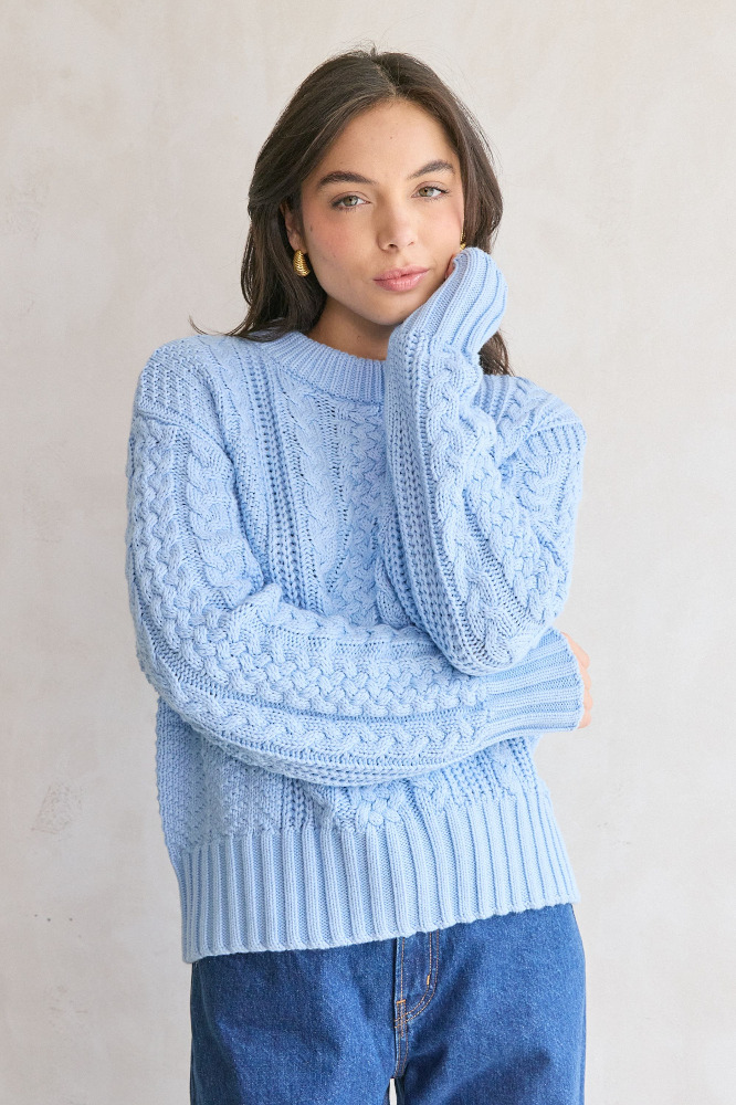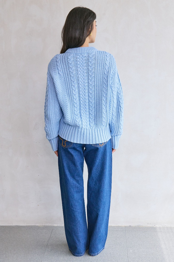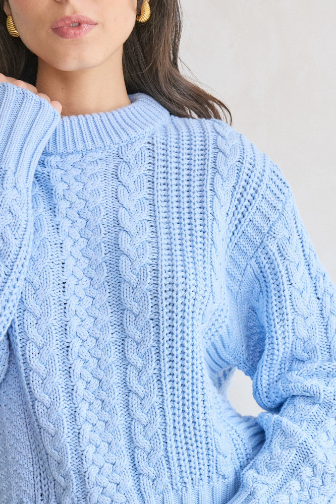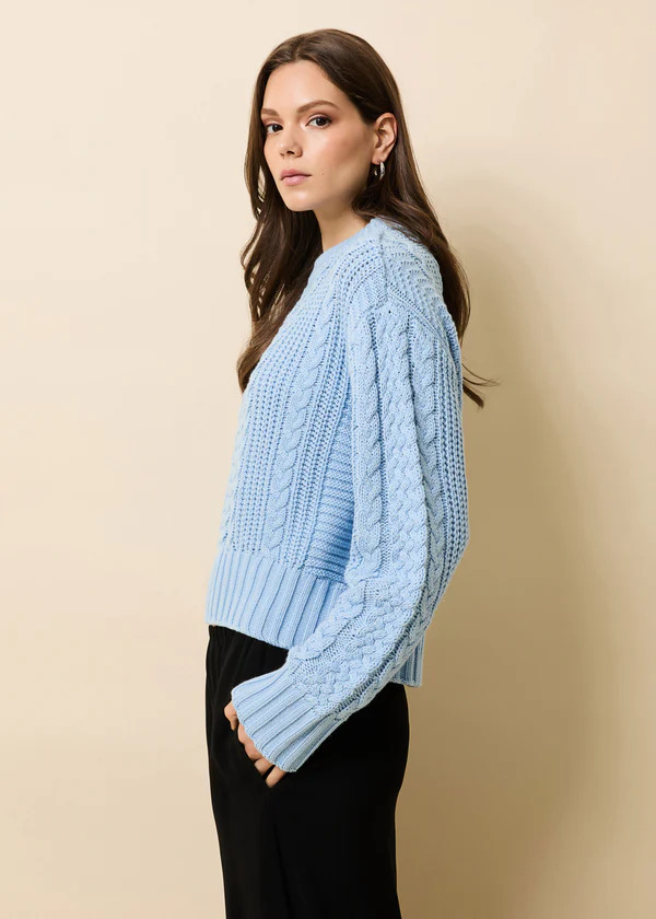 The Cora Sweater is a chunky pullover knit with a relaxed feel and elevated texture. Designed with a mix of cable stitches, it features balloon sleeves, a curved hem, and drop shoulders for easy layering. Finished with a classic crew neck and wide ribbed cuffs and hem for added structure.