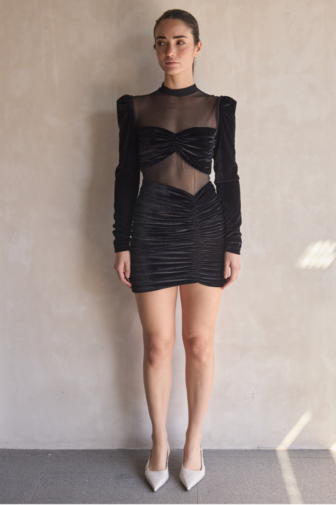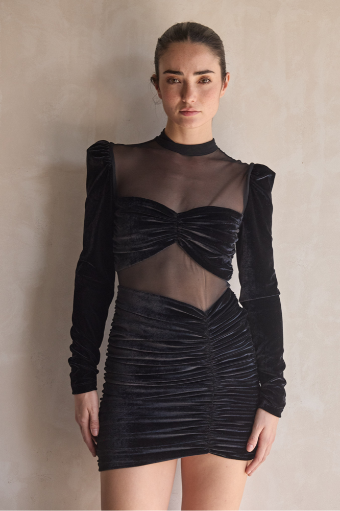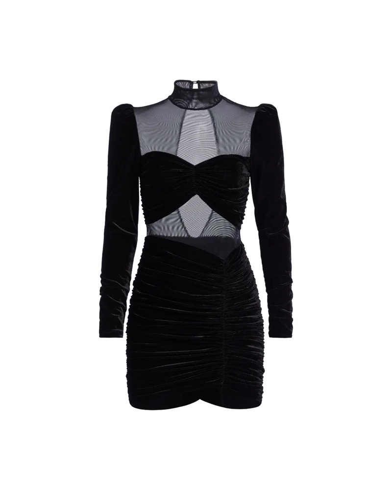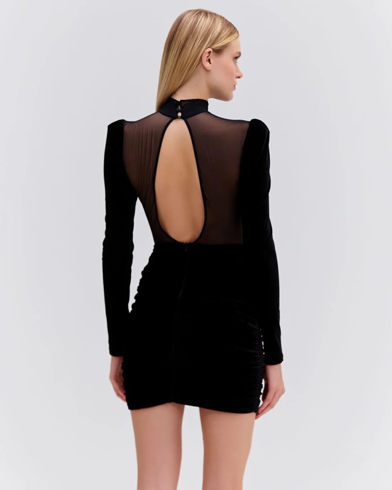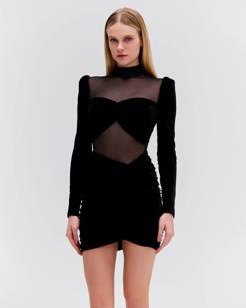 Velvet and Stretch Tulle Mini Dress with bodice mesh cut-outs in a super-soft stretch velvet fabric. Cut-outs on torso, bust and back are covered with sheer tulle fabric. Slightly structured shoulder detail with long sleeves. Mock neckline. Fully lined with concealed back-zipper closure. Runs true to size.