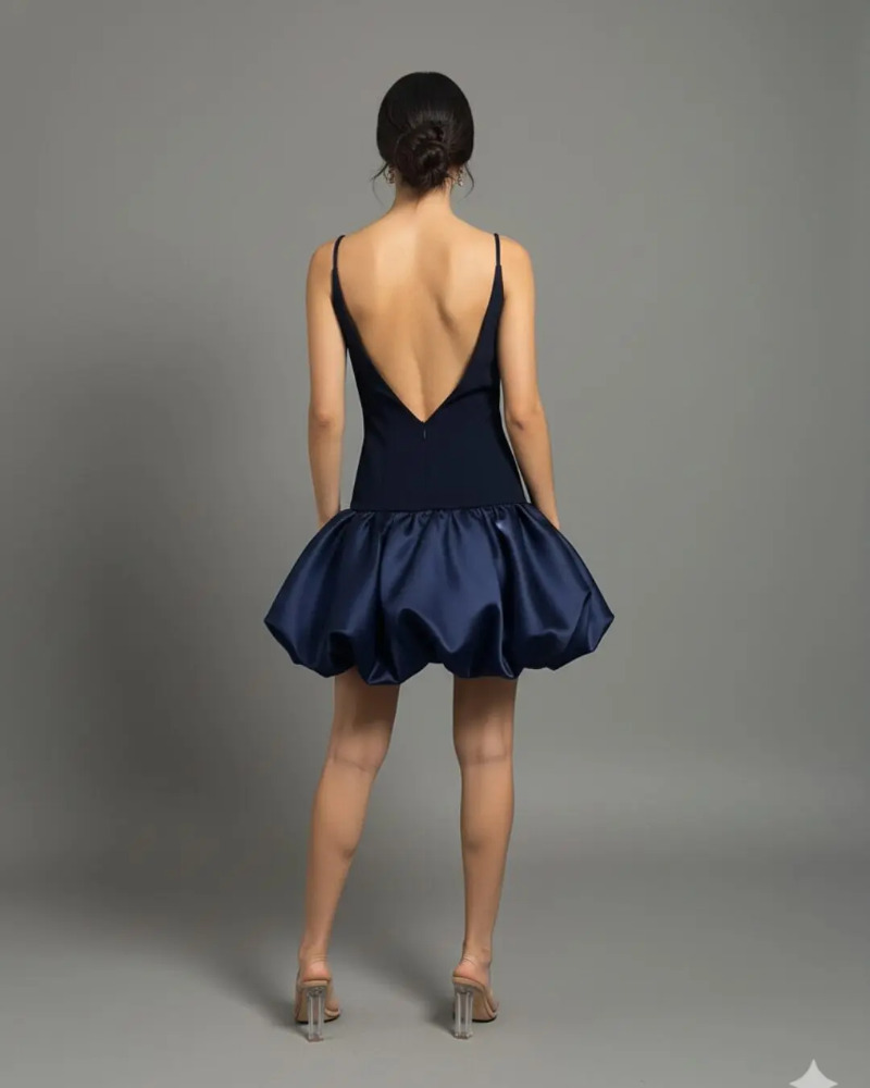 El Vestido Vivianne combina un body azul marino ajustado con escote cuadrado y tirantes finos. Se completa con una dramática y voluminosa falda bubble.