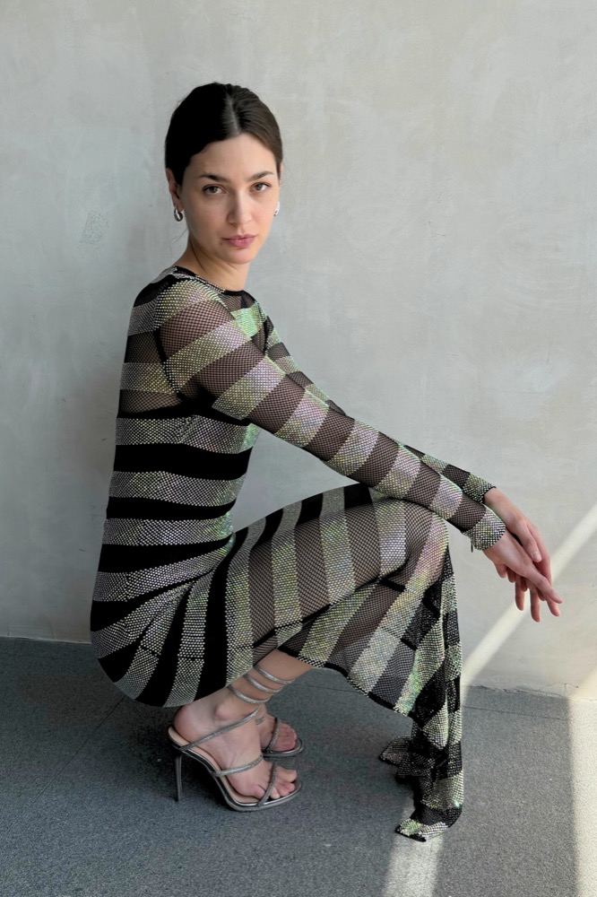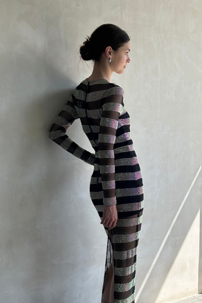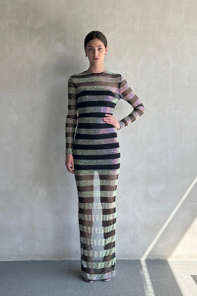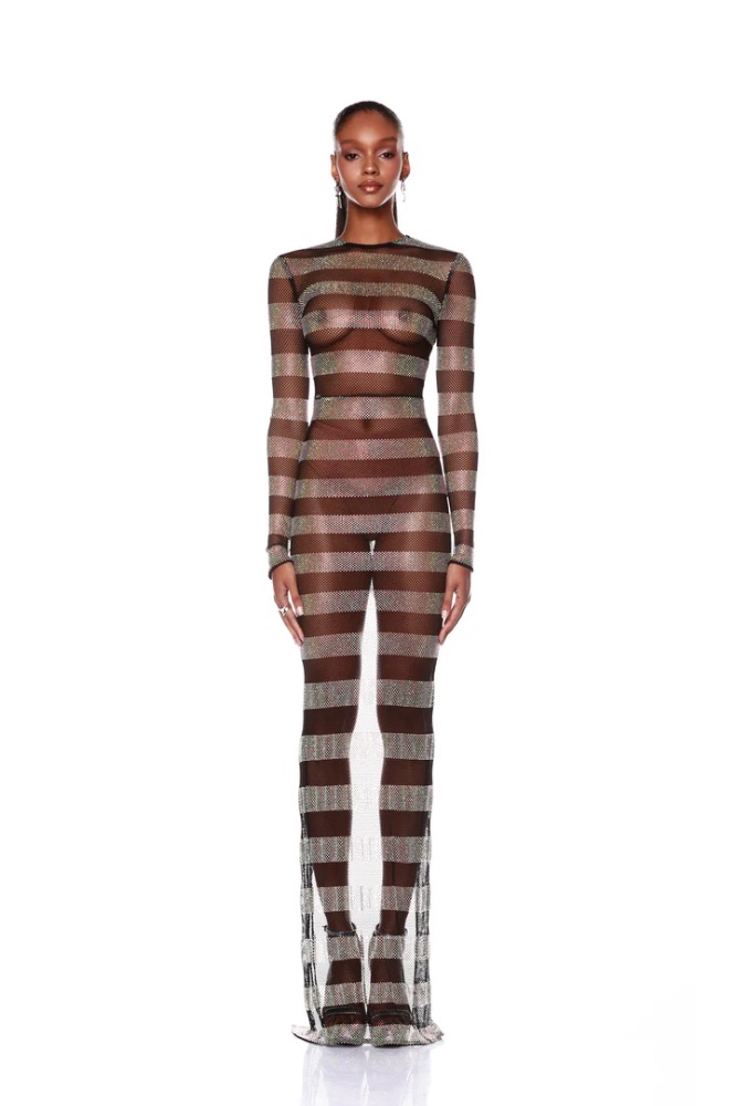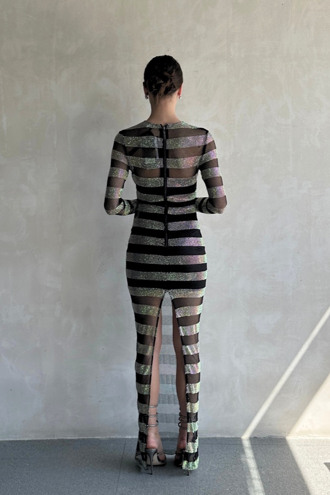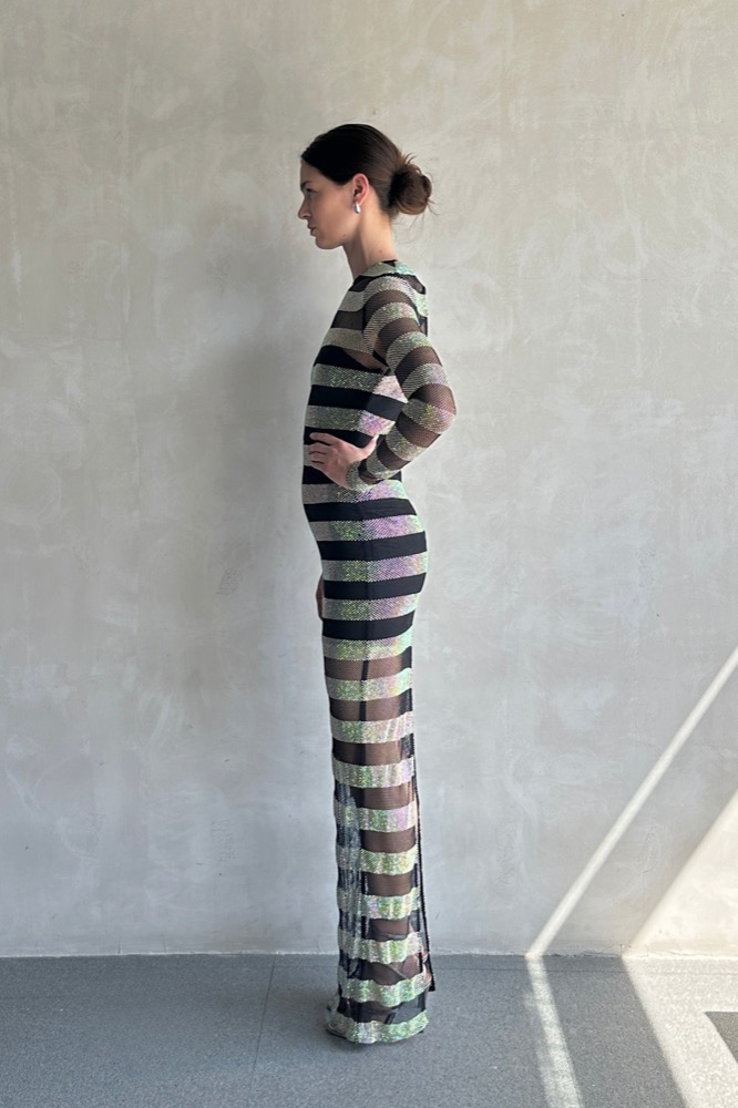 The Webb Striped Gown is a stunning embodiment of elegance and modernity. With its striking striped design, this gown flows gracefully to create a captivating silhouette.