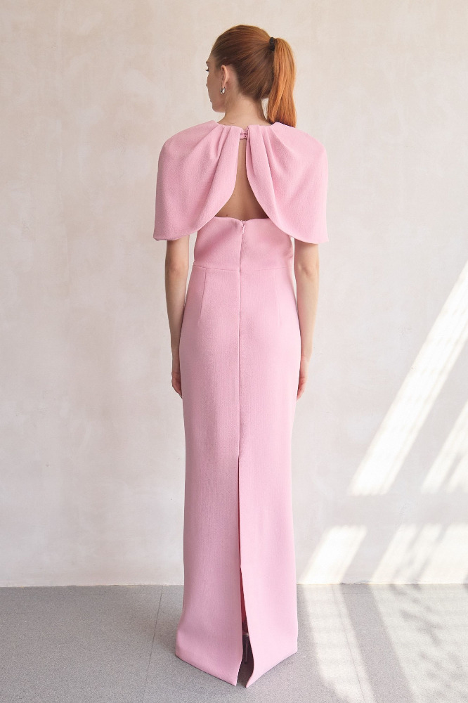 The Xena Gown in light pink radiates feminine elegance, tailored from bonded crepe. Its draped cape overlay and V neckline offer a sophisticated look, seamlessly complementing the fitted bodice, elevated with princess seams to refine the figure. The column maxi skirt shapes a graceful silhouette, detailed with a back split for added style. Fully lined and secured with an invisible zip fastening at the back, this gown is a timeless choice for your next special occasion.